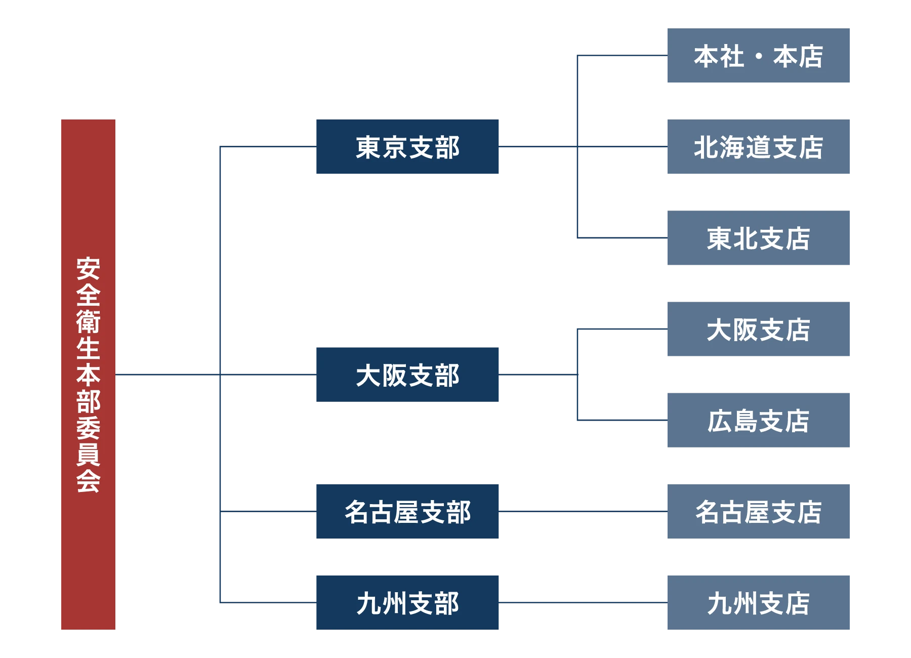 安全衛生管理に関する最高機関として、副社長が委員長となる安全衛生本部委員会を設置し、年に1回安全管理の方針について審議しています。また、地区ごとの支部では月に1回安全支部委員会を開催し、事故・災害の防止策や従業員や作業員の健康管理について協議を行っています。