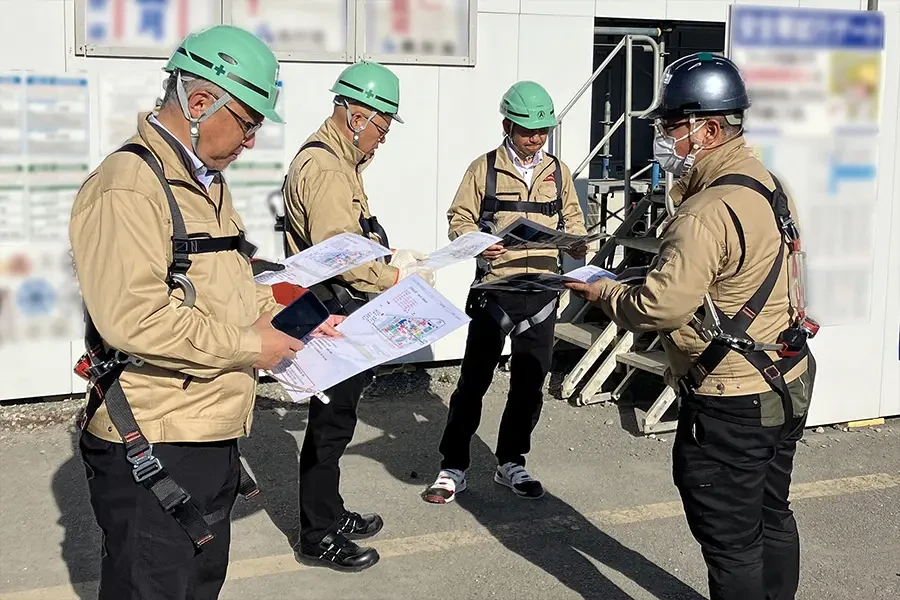 安全管理のエキスパートが請負工事の作業所へ安全巡回を実施しています。従事する作業員の方々が着工前に学習した安全教育をきちんと励行し安全作業が保たれているか施設、設備、作業員の行動を巡視し安全管理活動を行い、営業部門との連携を図っています。