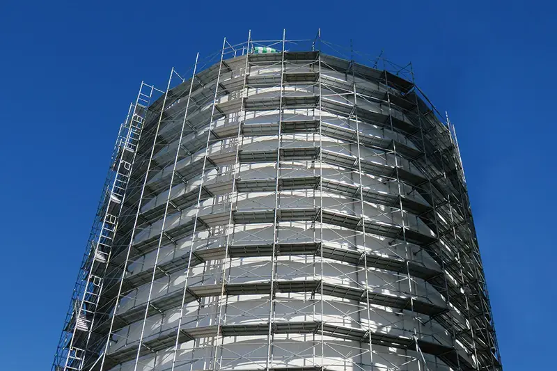 LNGタンクに設置したアルバトロスAKの円形足場。 専用の円形足場用先行手すり、伸縮手すりを用いることによって全て手すり先行工法で組立解体が可能。