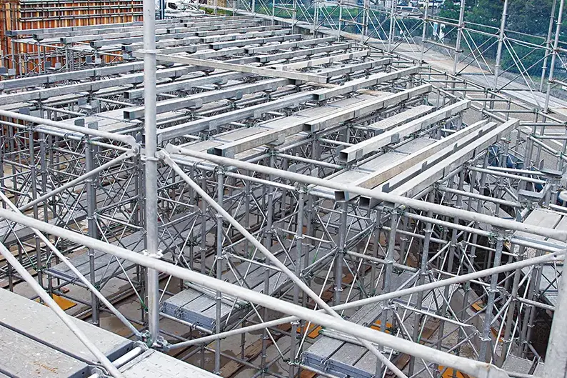 くさび式の専用システム支保工と同様にX・Y方向に自由なピッチで割り付け可能。さらに支保工も安全な手すり先行工法で組立・解体が可能に。