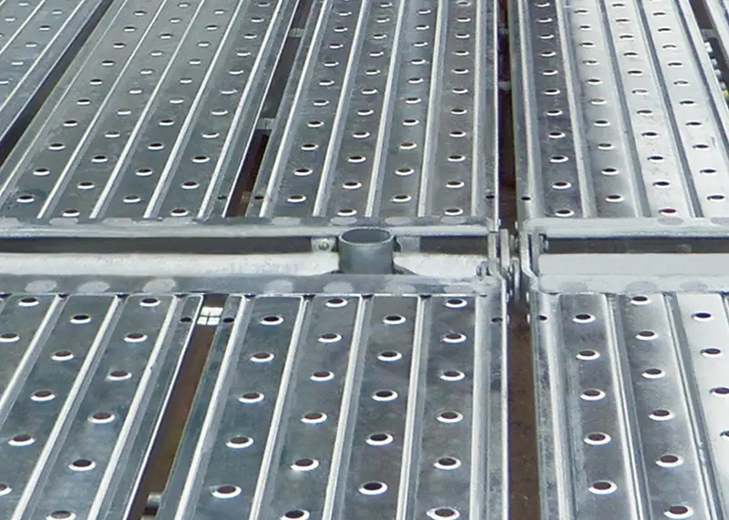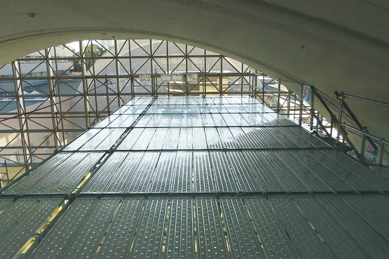 床付き布枠は支柱部をまたいで掛けることができ、突起や隙間のない広いステージが簡単に設置できます。支保工として使うときは大引受ジャッキを直接挿入することが可能です。ステージの外周には先行手すり・二段手すりが簡単に取付けられます。