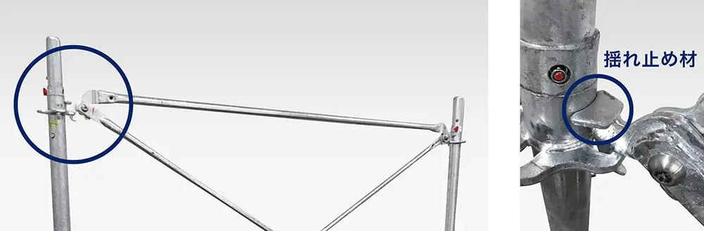 先行手すりに揺れ止め材を追加することにより、支柱への設置面積を増やし、組立・解体作業時により揺れにくい安心感のある足場へ進化しました。